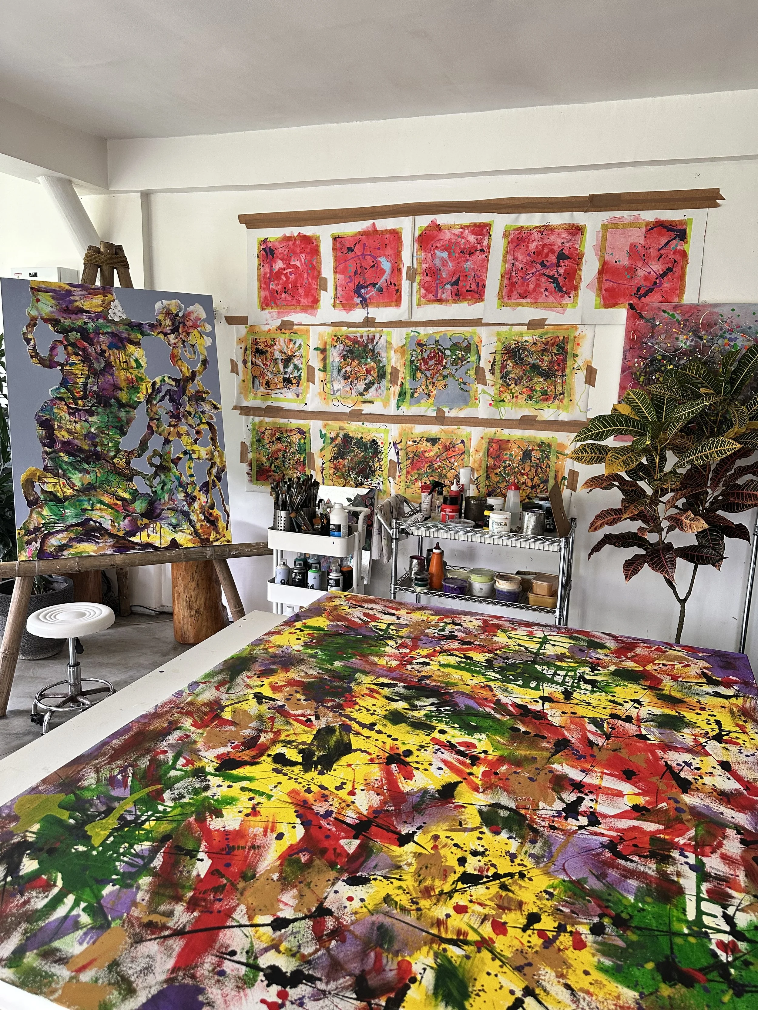 For my debut solo exhibit, I contemplate the contrast between order and chaos. I explore the interplay of clashing patterns and bold, complementary colors using acrylics, papers, inks, markers, spray paints, and various objects found in my studio. These elements come together to create shapes, patterns, light, and shadows that weave a story of our human resilience and adaptability.